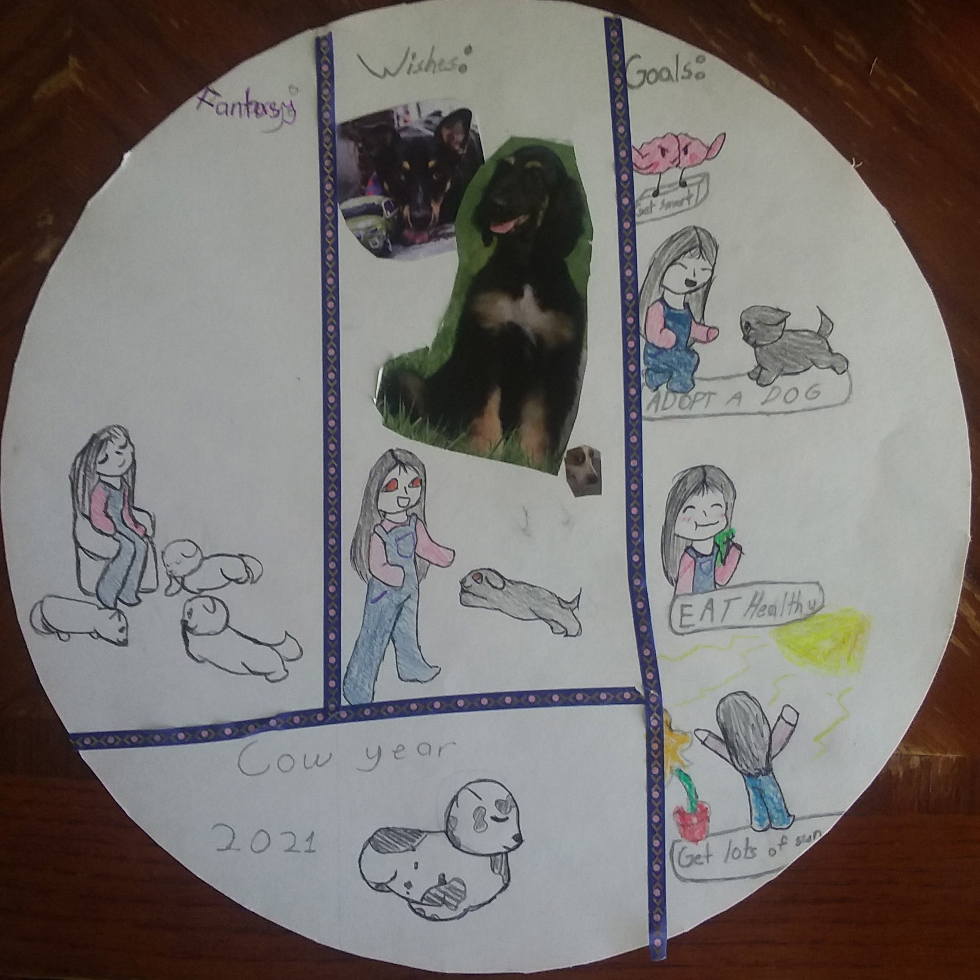 My daughter drew pictures of herself and some dogs with some affirmation words.