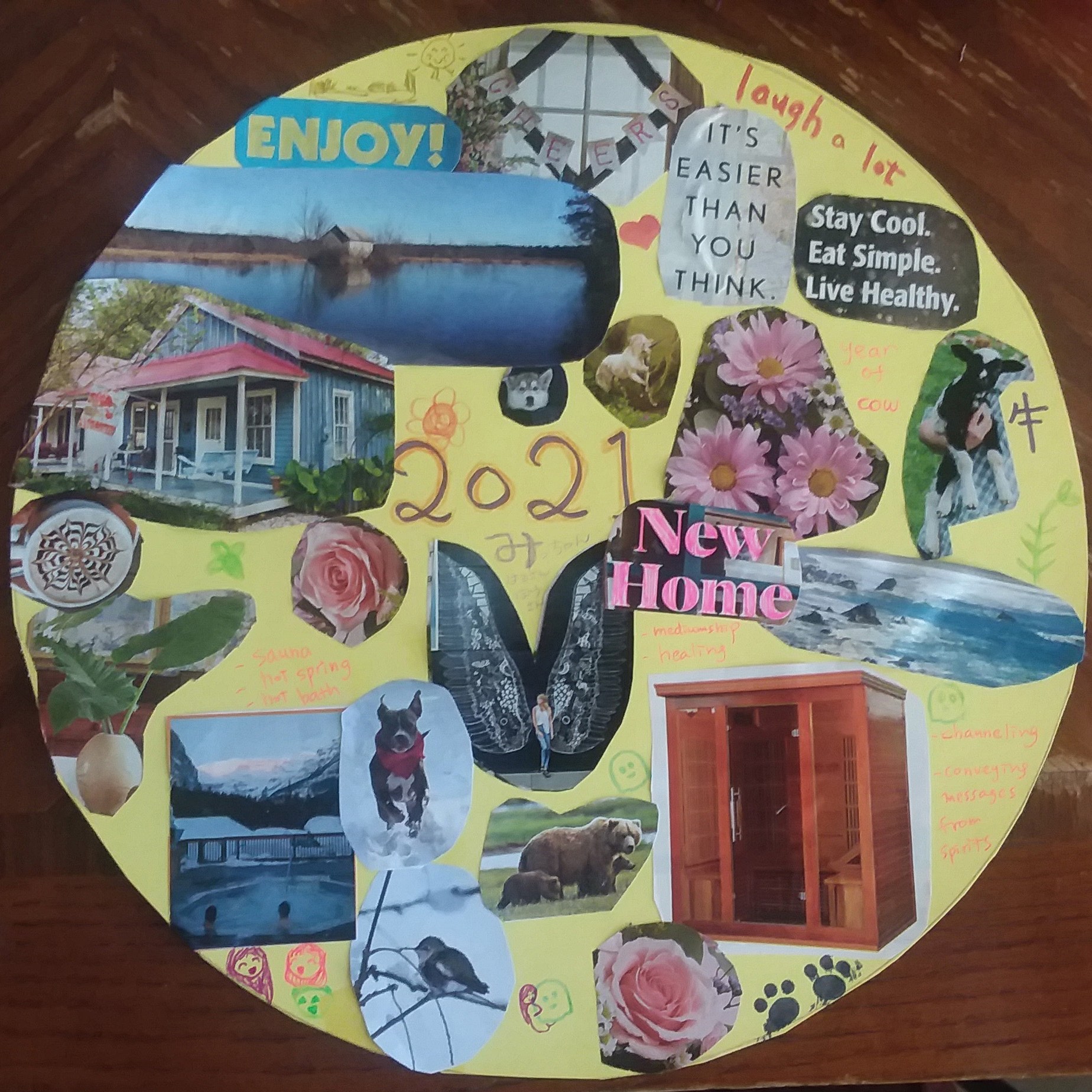 My family and I made a vision board for next year. My husband took a long time to go through magazines to select pictures for his vision board. After a long time, he grabbed a glue stick and some seconds later, he said he was done. Even though he took a long time, his vision board was super simple. He glued only one picture and wrote down one word. Maybe he just wants to have a simple year that means peaceful for him.